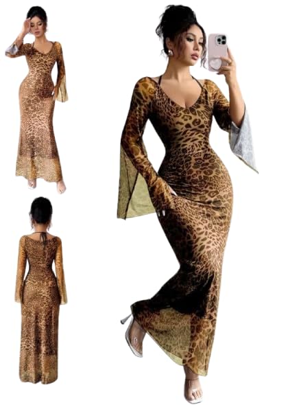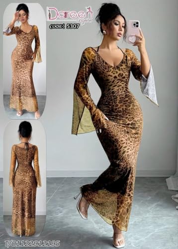 Generic - Dareen فستان طويل نسائي بنقشة النمر, بأكمام طويلة, فستان سهرة أنيق, موديل 5307