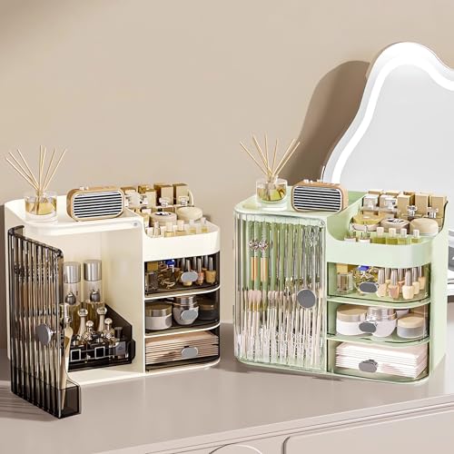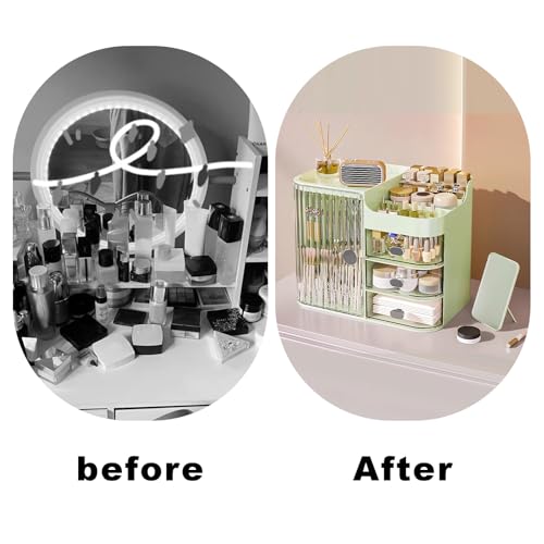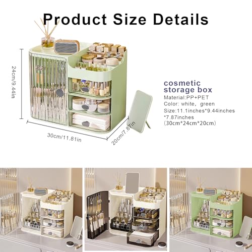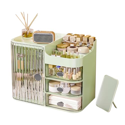DASITON - منظم مكياج مع مراية وحامل فرش المكياج وصندوق تخزين مكياج بثلاثة أدراج وبسعة كبيرة لمنظمات مستحضرات العناية بالبشرة والمكياج للزينة وغرفة النوم وسطح الطاولة من داسيتون، لون أخضر