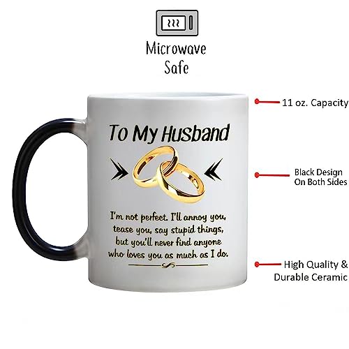- أفضل فكرة هدايا للزوج: يأتي كوب الزوج المضحك الخاص بنا مطبوعًا على كلا الجانبين بعبارة "I`m not perfect,I`ll annoy you,tease you,say stupid things,but you`ll never find any who love you as I do" هدية رائعة للزوج من الزوجة في عيد الحب وأعياد الميلاد والكريسماس والذكرى السنوية للزفاف والمناسبات الأخرى.
