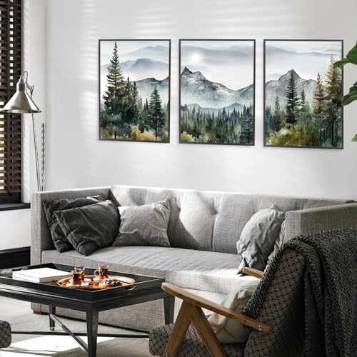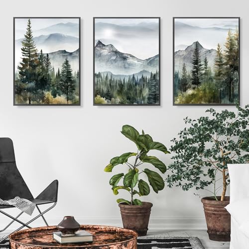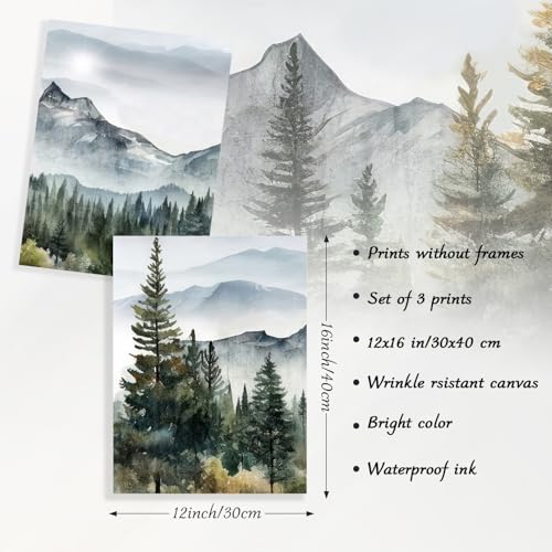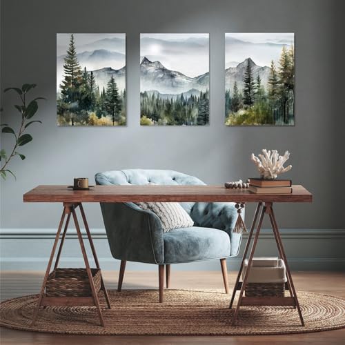 Dazzlewall - 3 قطع من دازل وول لوحة فنية جدارية بنمط غابة جبلية بألوان مائية، بوستر المناظر الطبيعية الحديثة لديكور المكتب وغرفة النوم وغرفة المعيشة مقاس 12 × 16 بوصة بدون إطار