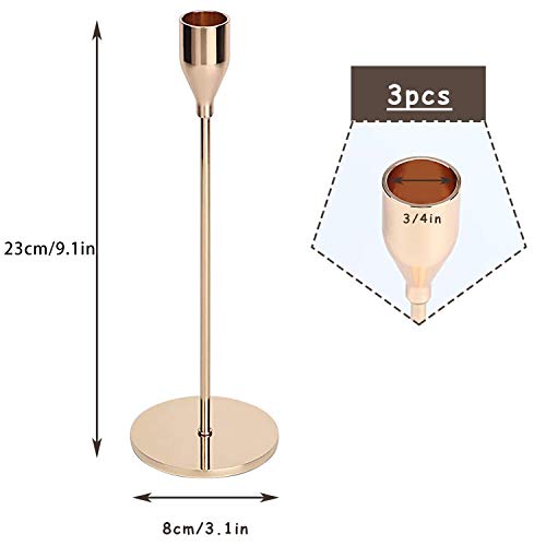 - عبوة من 3 حوامل شموع ذهبية مفردة، مصنوعة من الحديد عالي الجودة. قطر القاعدة 8 سم، ارتفاع 23 سم، مناسب للشموع المدببة مقاس 2 سم.