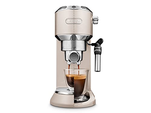 De'Longhi - ماكينة تحضير قهوة إسبريسو يدوية بمضخة باريستا من ديديكا ميتاليكس مع أداة خفق اللبن ومجموعة (إبريق الرغوة + أداة ضغط) لتحضير أمريكانو، كابتشينو، لاتيه، وماكياتو موديل EC785.BG باللون البيج