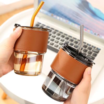 DE LUJO - مج زجاج بشفاطة من دي لوجو، 435 مل لون بني - 2 فوهة - مقبض جلد معزول بالحرارة - مناسب للمشروبات الساخنة والباردة