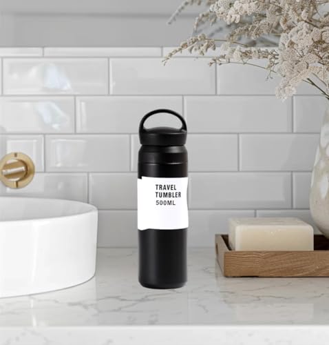 DE LUJO - زجاجة مفرغة من الهواء من فولاذ مقاوم للصدأ من دي لوجو، ترمس مانع للتسرب ومضاد للحروق بعزل مزدوج الجدران للمشروبات الساخنة والباردة، زجاجة مياه متينة للسفر، أسود، 500 ملليلتر