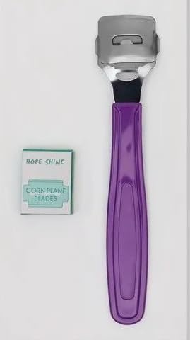 - ١) التصميم: مقبض مريح بنفسجي اللون مع شفرات فولاذية متينة قابلة للتبديل للتقشير الفعال