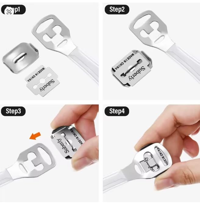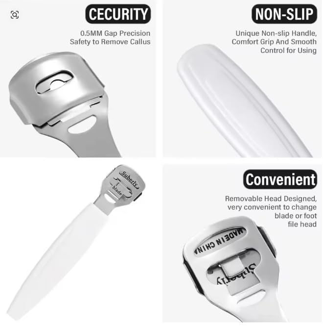 - ٢) المواد: شفرات مصنوعة من الفولاذ عالي الجودة لإزالة الجلد الميت بكفاءة وأمان