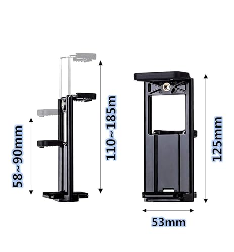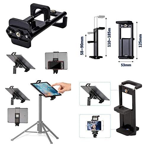 - 2 في 1، الوظيفة: يناسب تقريبًا جميع أجهزة التابلت والموبايلات بعرض 5.8 إلى 9 سم مع محول حامل ثلاثي القوائم قابل للتعديل للتابلت والموبايل، مسافة تمتد من 110 ملم إلى 185 ملم. متوافق مع كل موبايل ذكي من كل نوع وعلامة تجارية، ليس فقط لأصغر الجوالات ولكن أيضًا لأكبر جهاز تابلت