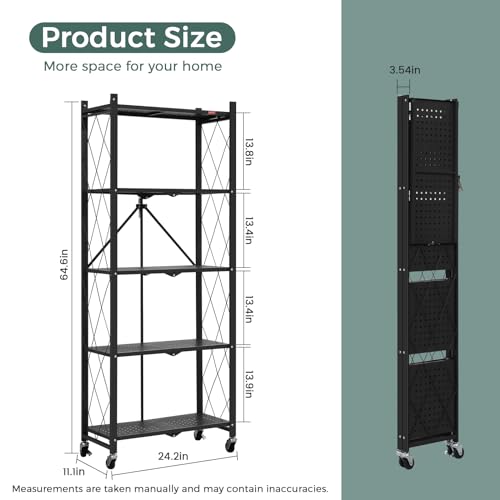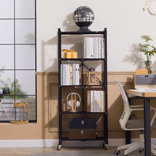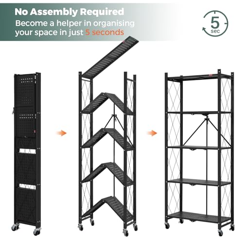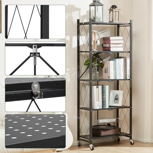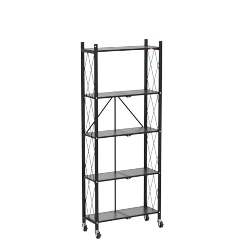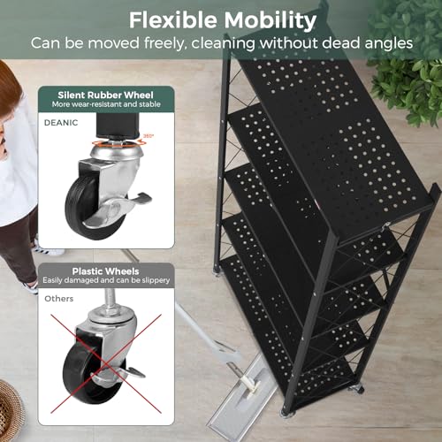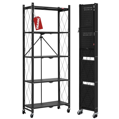 DEANIC - ارفف تخزين قابلة للطي من 5 مع عجلات وحدة رفوف ذات سعة كبيرة رف سلكي معدني قائم بذاته منظم بدون تجميع للمطبخ والجراج والقبو والمخزن شديد التحمل أسود