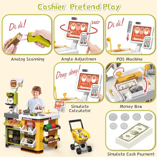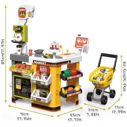 - دياو مجموعة ألعاب التسوق في السوبر ماركت | متجر تسجيل النقود للأطفال: تم تجهيز سجلات النقود وعربات التسوق الخاصة بنا بوظائف واقعية، وسجل نقود للأطفال مع ماسح ضوئي وصوت. يمكن ملء الفريزر بالماء لإحداث دخان مع الأضواء، ولف باب الفريزر ويبدو الأمر كما لو أن تيار الهواء البارد ينفخ. مع هذه الميزات، سيكون أطفالك مشغولين ومستمتعين لساعات.