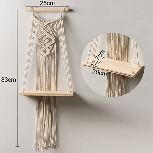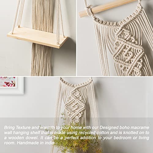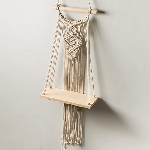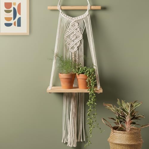 Decazone - رف مكرمية للتعليق على الحائط بنمط أوراق شجر من ديكازون، رف خشبي من خشب الصنوبر، ديكور بوهيمي بحبل قطني مع وتد | لون بيج