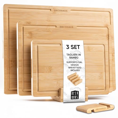 Deco haus - لوح تقطيع من خشب البامبو القوي باخدود للعصير للمطبخ من ديكو هاوس، مجموعة من 3 قطع، سمك 2 سم، 40 × 30 سم و33 × 24 سم و26 × 18 سم