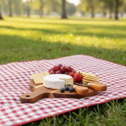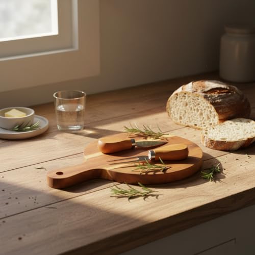 Deconox - مجموعة لوح تقديم جبن اكاسيا الطبيعي من ديكونوفو - لوح تقطيع صغير 25 × 17 سم بمقبض وسكين وشوكة مع مقبض خاص من الخيزران (3 قطع)