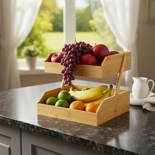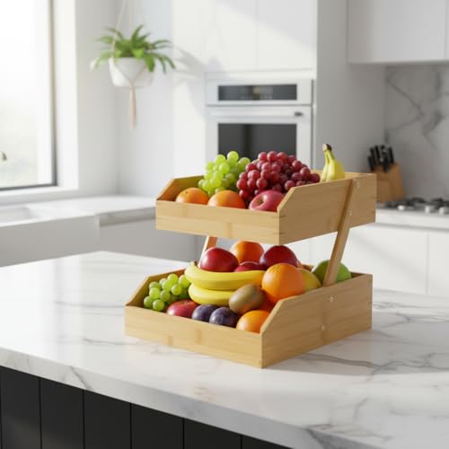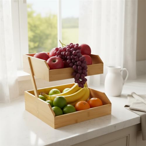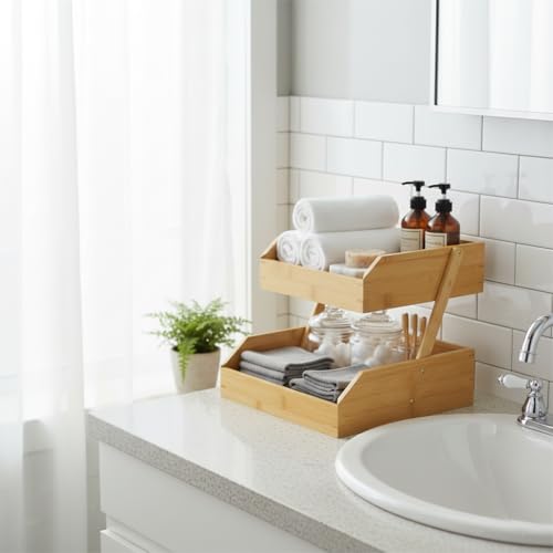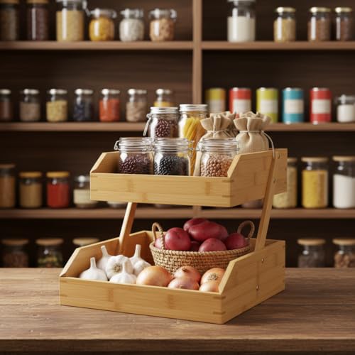 Deconox - منظم ديكور للمطبخ والحمام من الخيزران الطبيعي بطبقتين من ديكونوفو | رف منظم متعدد الاغراض | رف للفاكهة المقرمشة والتوابل، رف حمام، 26 × 32 × 23 سم