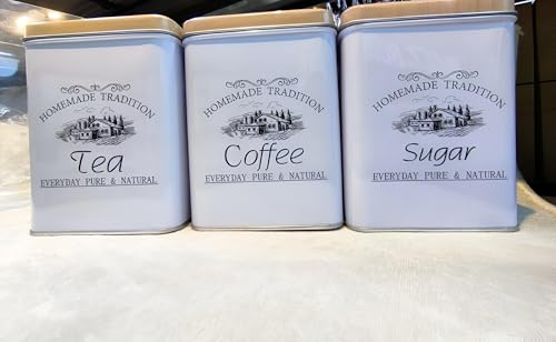 - تم تصميم هذه الحاويات بزخارف "تقليدية محلية الصنع" الحنين إلى الماضي وتوضيح ريفي عتيق، تضفي جماليات بيت المزرعة الخالدة في مطبخك، مما يوفر جاذبية زخرفية وتخزين منظم للضروريات اليومية مثل القهوة والشاي والسكر.