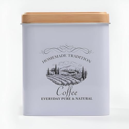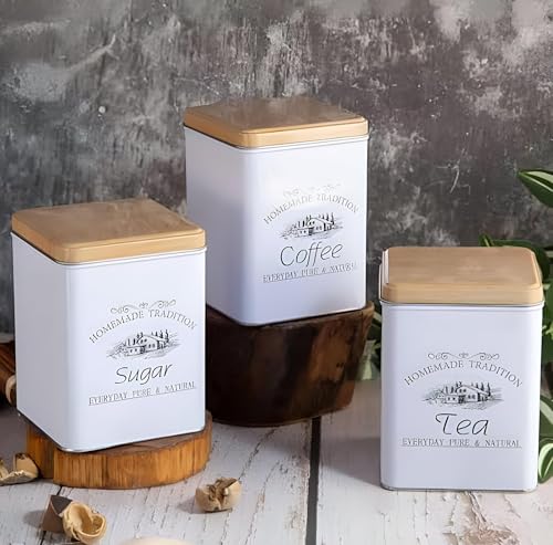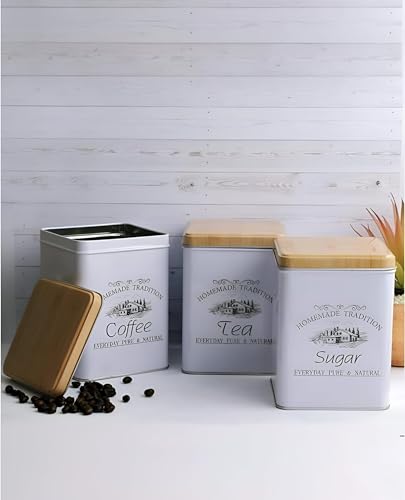 Generic - علب مزخرفة - حاويات تخزين مطبخ معدنية بيضاء على طراز بيت المزرعة مع اغطية من الخيزران للقهوة والشاي والسكر وتنظيم منزلي انيق