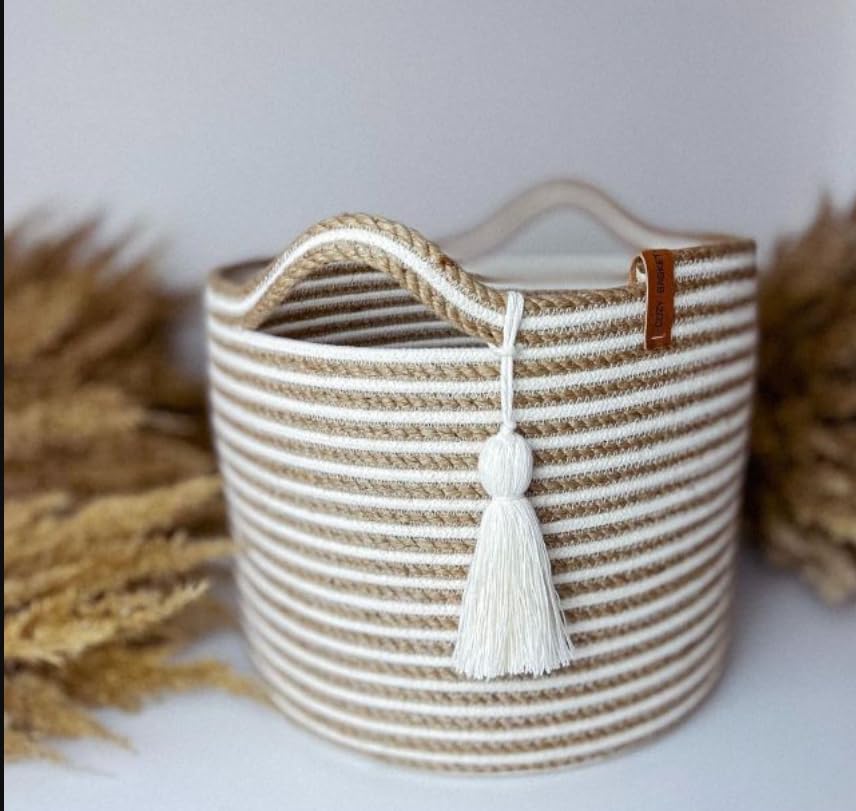 - تخزين متعدد الاستخدامات: سلة مصنوعة يدويًا من الحبال القطنية بنمط مخطط من الجوت الطبيعي، مثالية لتنظيم الألعاب أو البطانيات أو المجلات أو الغسيل