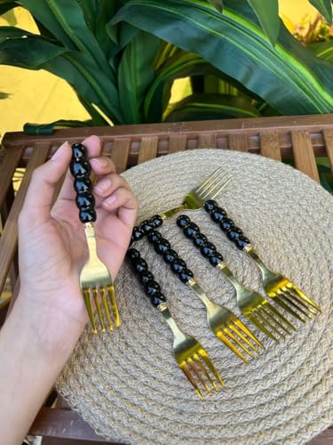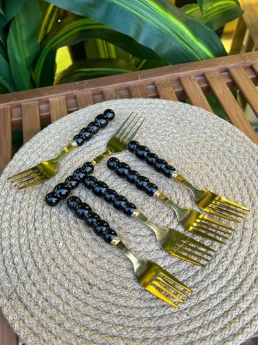 Generic - طقم شوك عشاء مزخرفة بمقابض مطرزة باللون الأسود من الفولاذ المقاوم للصدأ بلون ذهبي، 6 قطع