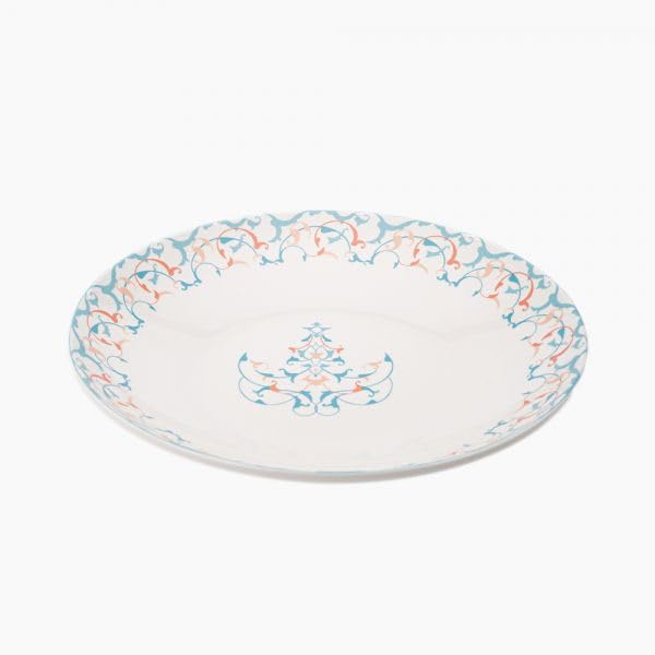 - تفاصيل النمط: نمط مميز مزدوج اللون يجمع بين الألوان المرجانية الناعمة والأزرق في ترتيب زهور فني حول الحافة