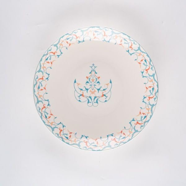 - تصميم أنيق: طبق عشاء جميل من البورسلين الأبيض يتميز بحواف بنمط زهور زرقاء ومرجانية معقدة مع زخرفة مركزية رقيقة