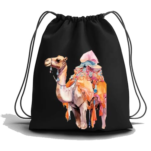 Generic - شنطة ظهر مزخرفة برباط مع طباعة فنية بلون جملي، قماش أسود، شنطة كبيرة توت