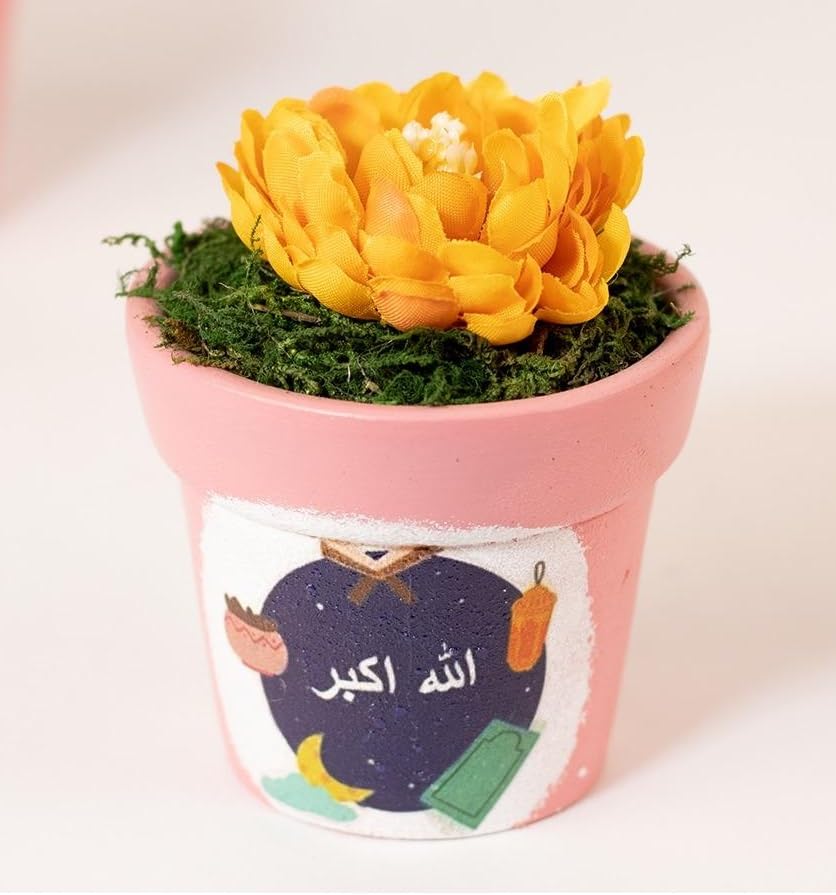 Generic - أصيص زهور مزخرف مع زهرة صناعية صفراء، وعاء نباتات من السيراميك بلون وردي مع طحالب، مزين بخط إسلامي
