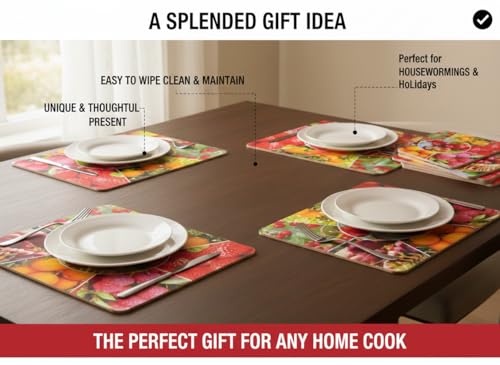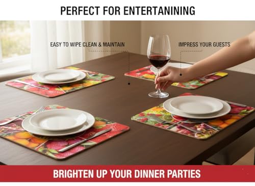 - تصميم زخرفي نابض بالحياة: تتميز بطبعات فاكهة مذهلة عالية الدقة بما في ذلك الكرز والفراولة والبرتقال والليتشي التي تضفي نمطًا ملونًا على طاولة الطعام الخاصة بك أثناء استخدامها كمفارش عملية