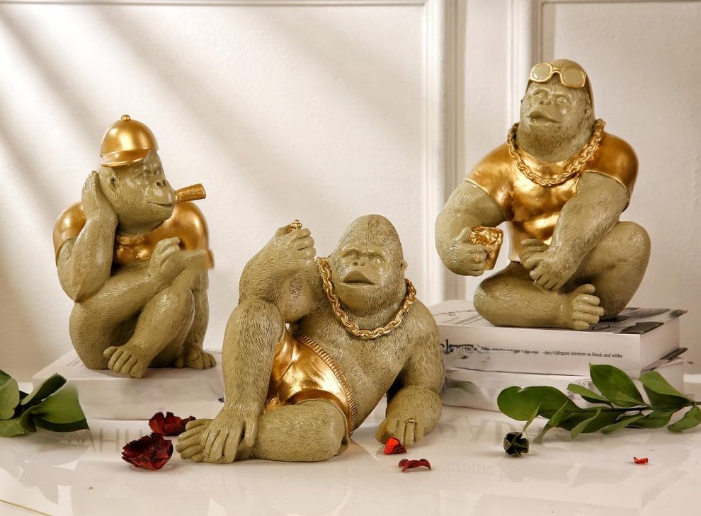 - تصميم جذاب: مجموعة مكونة من 3 مجسمات غوريلا معاصرة تتميز بلمسة نهائية سوداء مطفية بلمسات ذهبية فاخرة واكسسوارات عصرية مثل النظارة الشمسية والسلاسل.