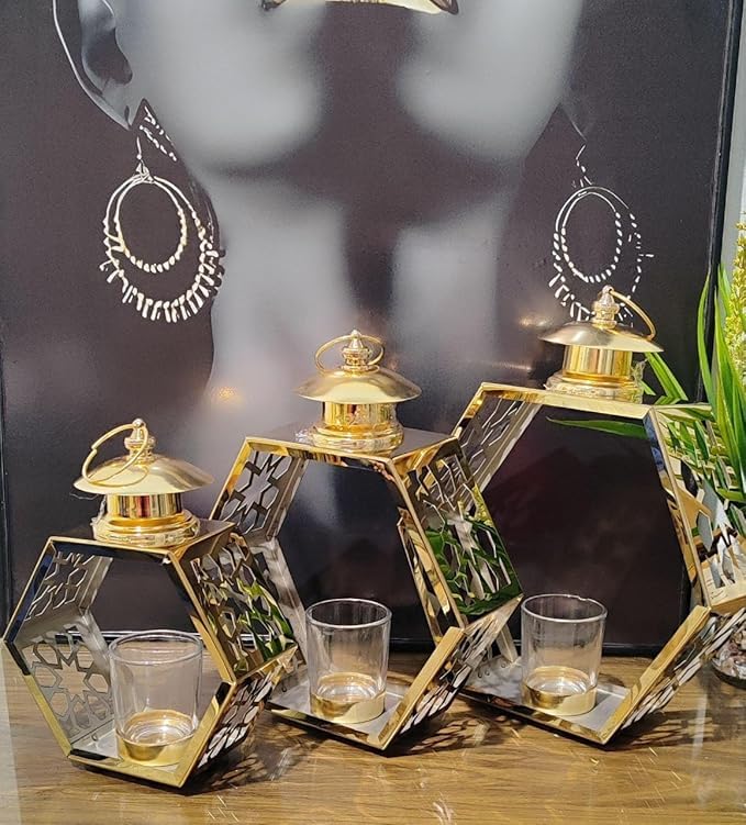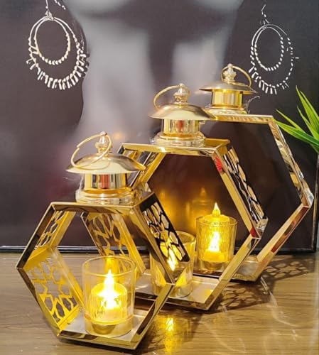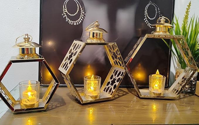 Generic - فوانيس سداسية للديكور مع شموع ليد وبإطار معدني ذهبي وتصميم حديث، مجموعة من 3 قطع