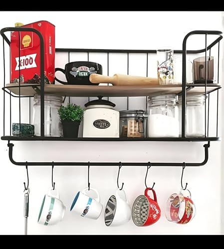 Generic - رف مطبخ للديكور، رف سلكي معدني عملي مدمج مع لوح خشب وخمسة خطافات، مثالي لتعليق الفوط أو أدوات المطبخ، مقاس 50 سم (عرض)، 15 سم (عمق)، 15 سم (ارتفاع)