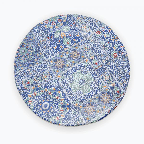 - التصميم: طبق ميلامين بنمط فسيفساء أزرق مذهل يتميز بتصميمات تقليدية معقدة مع زخارف زهرية وهندسية أنيقة