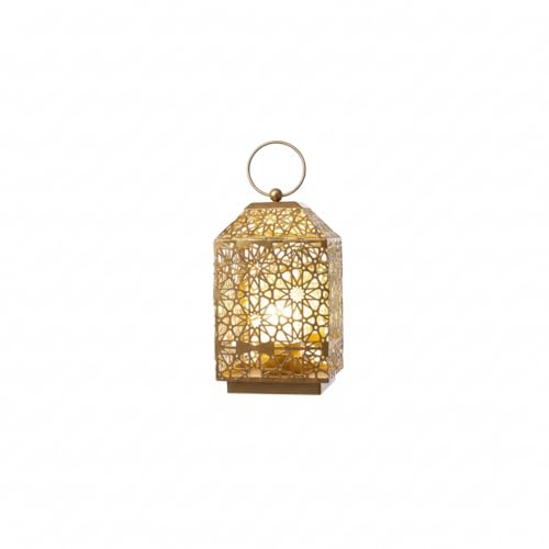 Generic - فانوس معدني مزخرف بنمط هندسي، لمسة نهائية ذهبية، مصباح شمعة LED، ديكور رمضان، معلق او عرض سطح الطاولة مع مقبض حلقي