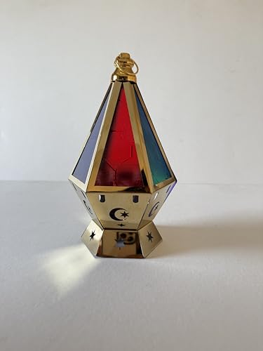- مزايا التصميم: فانوس بشكل هندسي أنيق مصنوع من معدن ذهبي فاخر مع أنماط زخرفية على شكل قمر ونجوم.