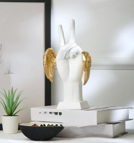 Generic - منحوتة يد مزخرفة بعلامة السلام مع اجنحة ذهبية، لمسة نهائية سوداء غير لامعة، ديكور منزلي عصري (ابيض)