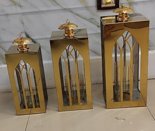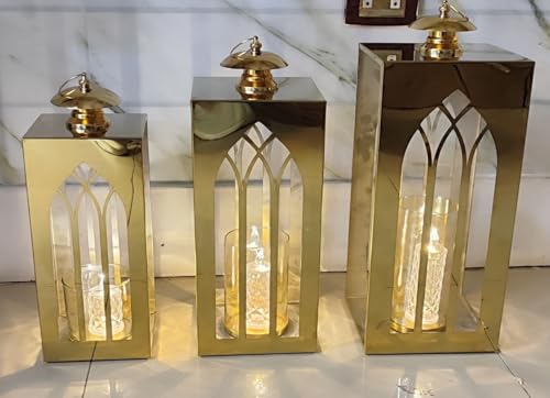 Generic - مجموعة فانوس رمضان للديكور، بتصميم قوس قوطي، 3 قطع حوامل شموع معدنية بنقوش هندسية