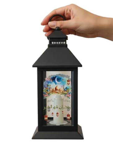 Generic - فانوس رمضان زخرفي مع مسجد وهلال، إضاءة ديكور إسلامي، أسود/أبيض، حامل شموع، ديكور منزلي (اسود)