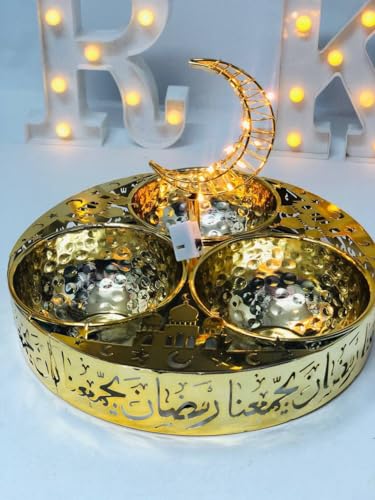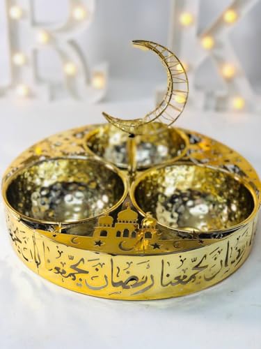 Generic - بولة للوجبات الخفيفة بتصميم رمضاني للزينة، مصنوعة من المعدن الذهبي ومزينة بهلال والخط العربي، 3 أقسام