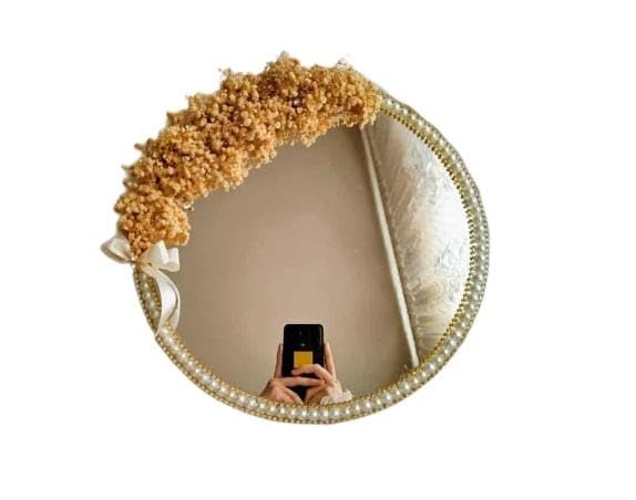- تصميم أنيق: مراية حائط دائرية مزخرفة تتميز بإطار مذهل بلون ذهبي مزين بالكريستال واللؤلؤ مع تفاصيل زهرية معقدة.