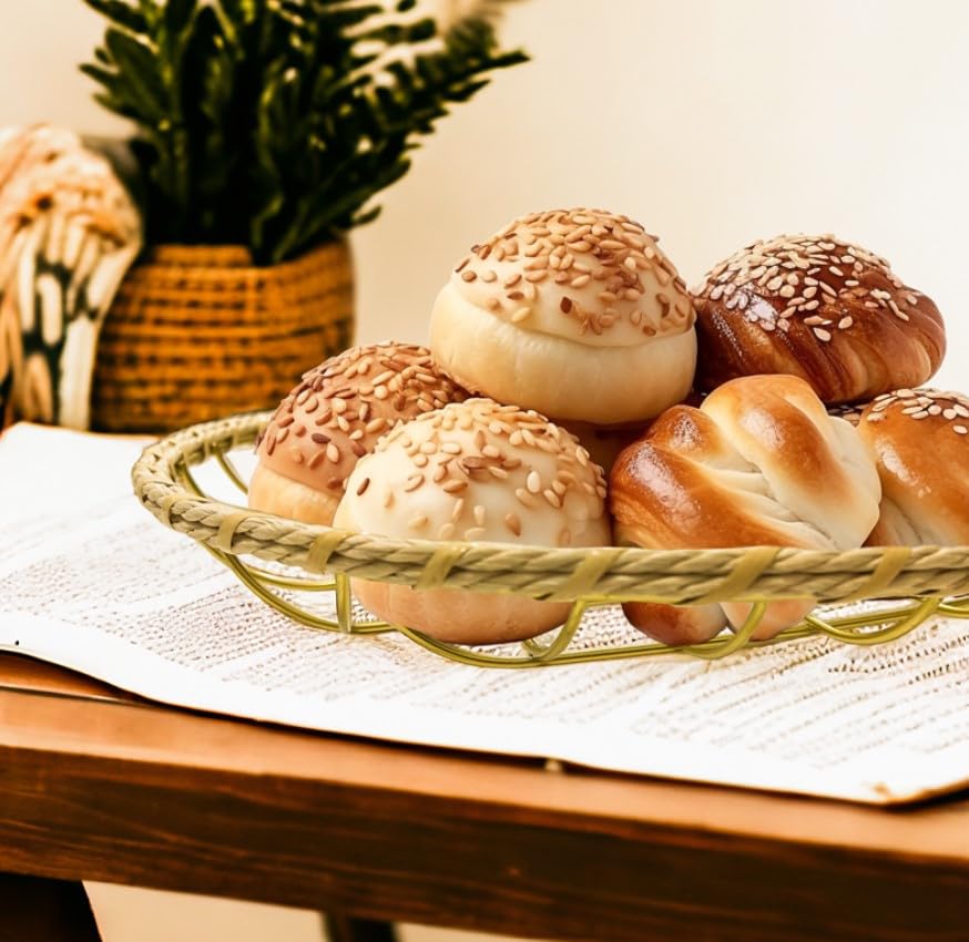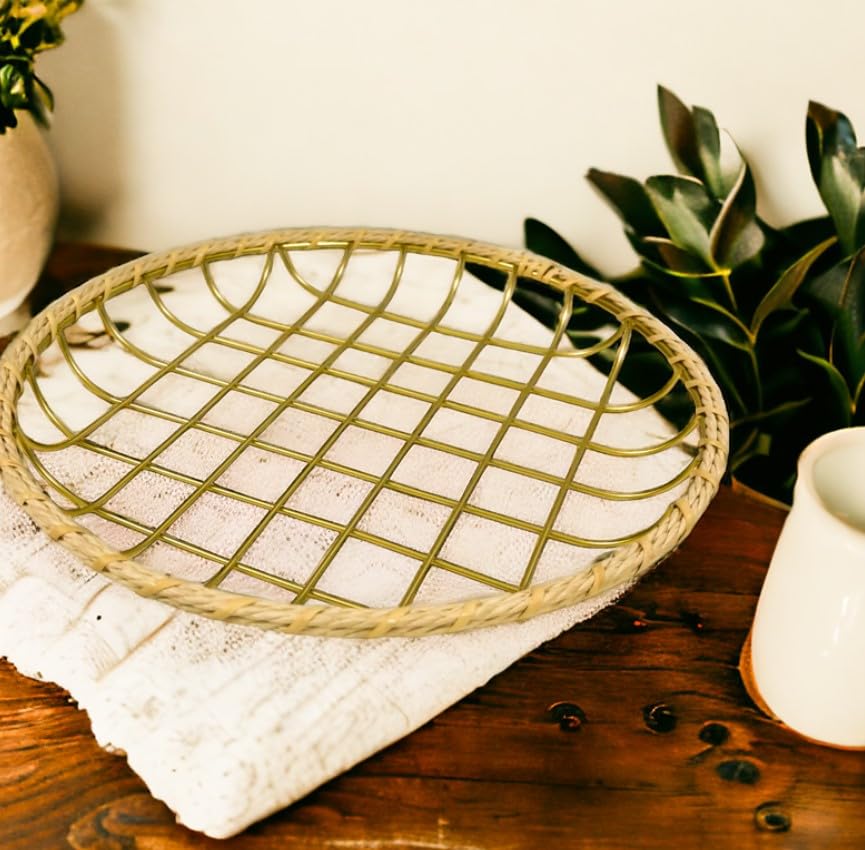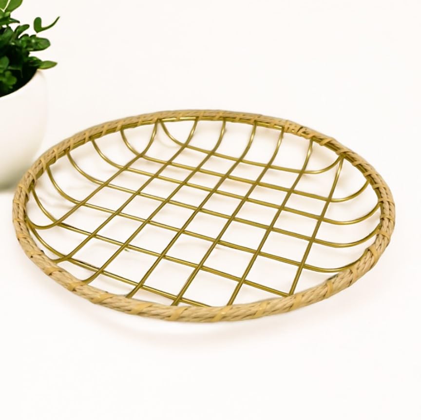 - تصميم متعدد الاستخدامات: صينية تقديم دائرية تتميز بنمط شبكي معدني أنيق بلون ذهبي وزخرفة من الروطان الطبيعي، مثالية لعرض المعجنات أو الخبز أو العناصر الزخرفية