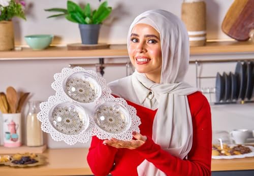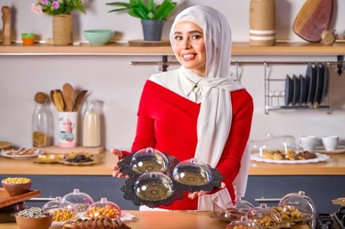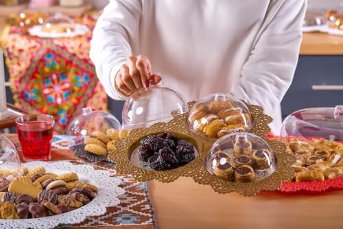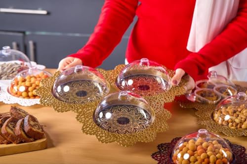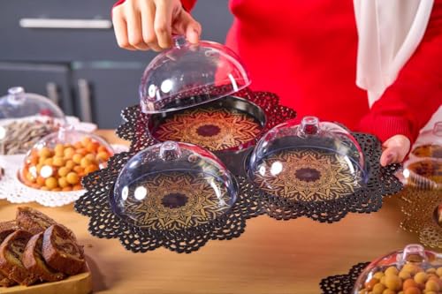 - مجموعة تقديم أنيقة: تتميز مجموعة التقديم المزخرفة المكونة من 3 قطع بأطباق مزخرفة من الدانتيل الذهبي مع قباب أكريليك شفافة، مثالية لتقديم المعجنات والحلويات والمقبلات بأسلوب راقي