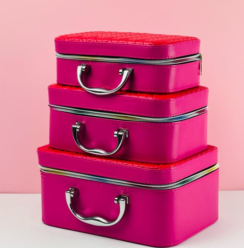 - تصميم أنيق: حقائب تخزين متداخلة جميلة باللونين الوردي والأحمر تتميز بألواح علوية مبطنة ومقابض من الكروم وإغلاق بسحاب آمن لتنظيم أنيق
