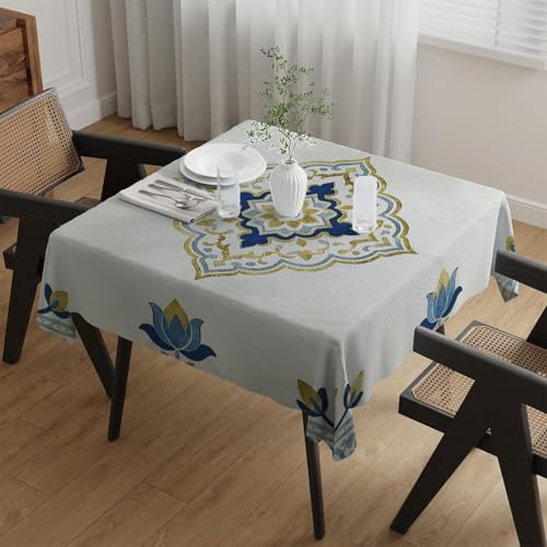 Ocra - غطاء طاولة مزخرف بنمط زهور زرقاء وذهبية، خلفية خضراء فاتحة، تصميم حواف مزخرفة (غطاء 75 × 75 سم)