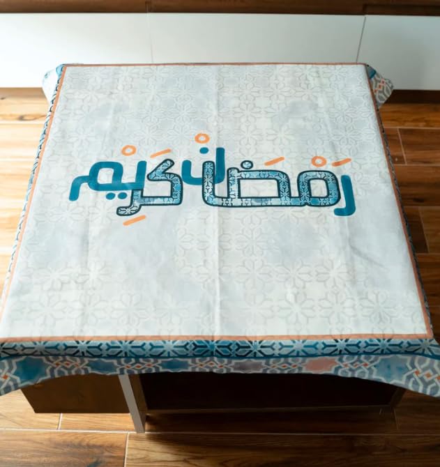 Generic - مفرش طاولة مزخرف بنص عربي، قماش مخملي ناعم، تصميم حواف باللونين الازرق والبرتقالي، متوفر بمقاسات متعددة، 90 × 90 الى 140 × 280 سم (140 × 140)