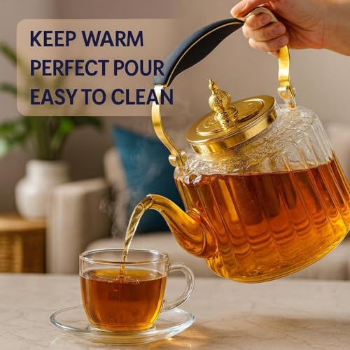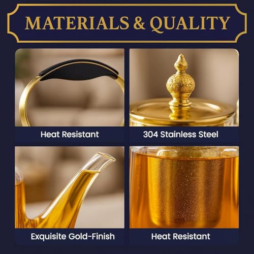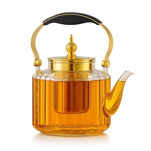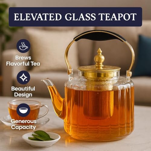 - يتميز إبريق الشاي الزجاجي الفاخر هذا بتصميم شفاف للغاية يعرض بشكل جميل لون الشاي المخمر الخاص بك، ويكمله لمسات معدنية ذهبية أنيقة. يضيف غطاء التاج المزخرف لمسة من الرقي، مما يجعله مثاليًا للاستخدام اليومي والمناسبات الخاصة.