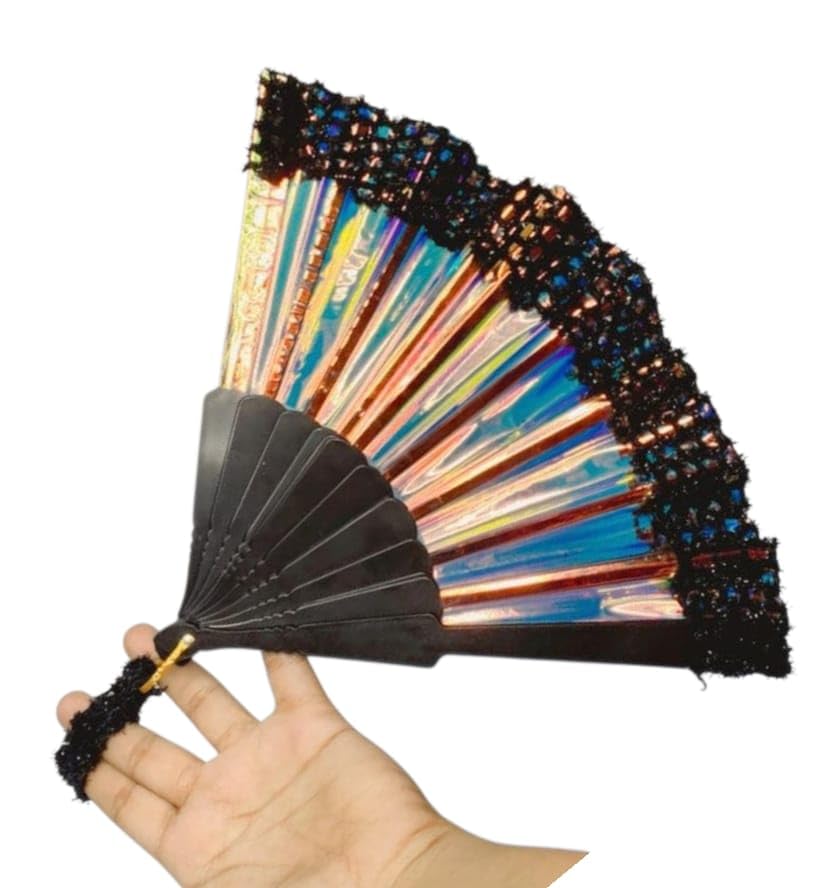 - تصميم عصري: مروحة يدوية بتصميم هولوغرافي مع إطار أسود أنيق وزخارف دانتيل سوداء