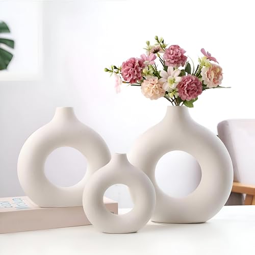Generic - فازة مزخرفة - ملحق ديكور عصري من السيراميك الأبيض مصمم لعرض الزهور البسيطة، تتضمن ثلاث فازات دائرية مجوفة مطفية مناسبة للمنزل أو الاحتفالات أو تزيين المناسبات