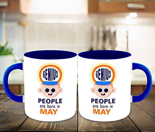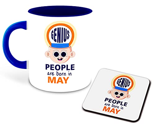 DecorVecor - مج للقهوة من السيراميك بلون ازرق داكن من الداخل مزين بطباعة عبارة Genius are Born in May مع قاعدة اكواب من ديكور فيكور، كوب شرب للحليب ملائم كهدية لتمني عيد ميلاد سعيد (مالتي 14)