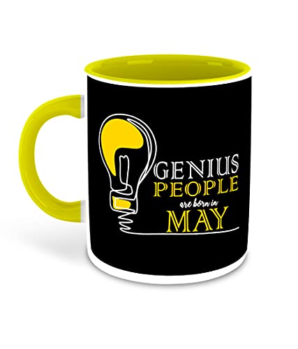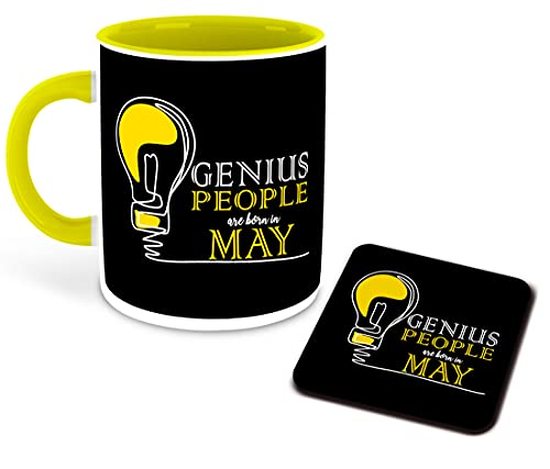 DecorVecor - مج للقهوة من السيراميك بلون اصفر من الداخل مزين بطباعة عبارة Genius are Born in May مع قاعدة اكواب من ديكور فيكور، كوب شرب للحليب ملائم كهدية لتمني عيد ميلاد سعيد (مالتي 5)