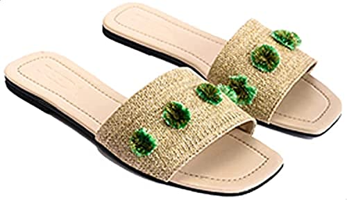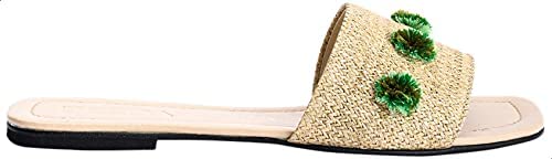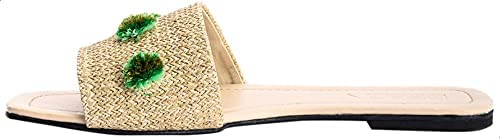 Deeda - شبشب سلايدز جلد صناعي مزين بورود مخيطة في الجزء العلوي للنساء من ديدا - بيج واخضر