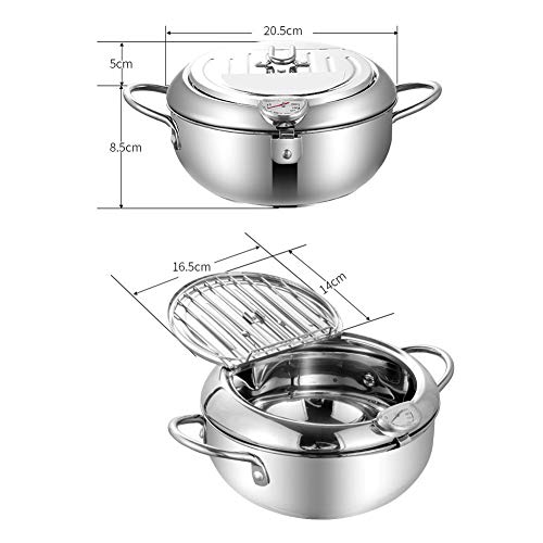 EKDJKK - مقلاة عميقة من الستانلس ستيل سعة 2.2 لتر، مقلاة تمبورا مع ميزان حرارة وغطاء ورف لتقطير الزيت للدجاج المقلي والروبيان والرقائق الفرنسية (20 سم/7.87 انش، 304)
