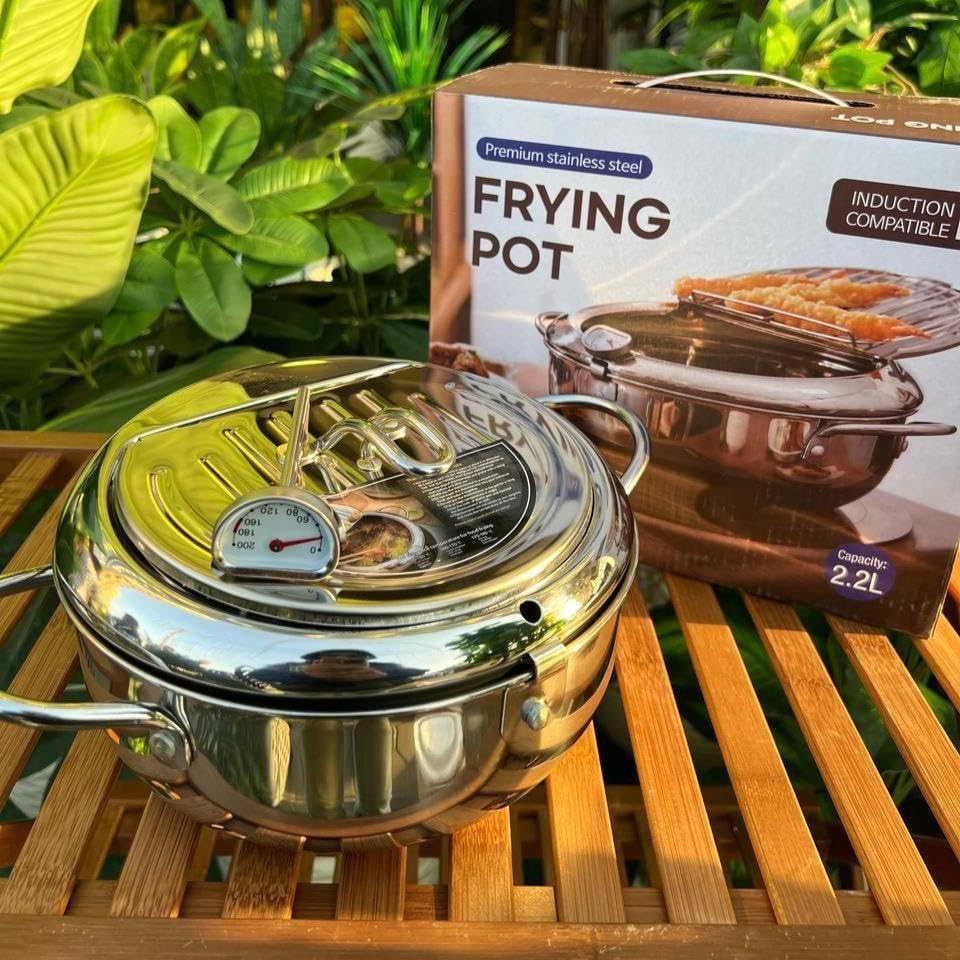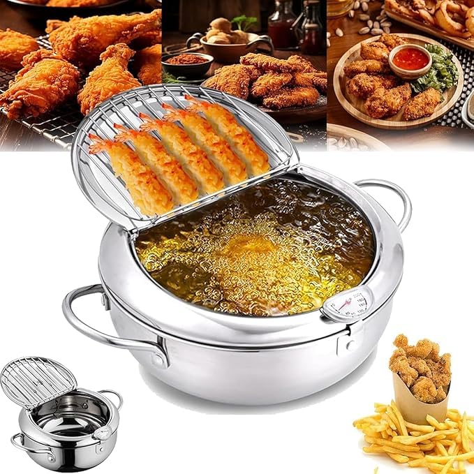 Generic - Deep frying pan with strainer and thermometer sensor - Stainless steel frying pan with thermometer and multi-purpose oil drip tray